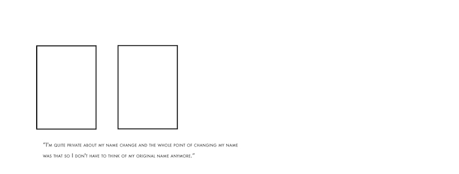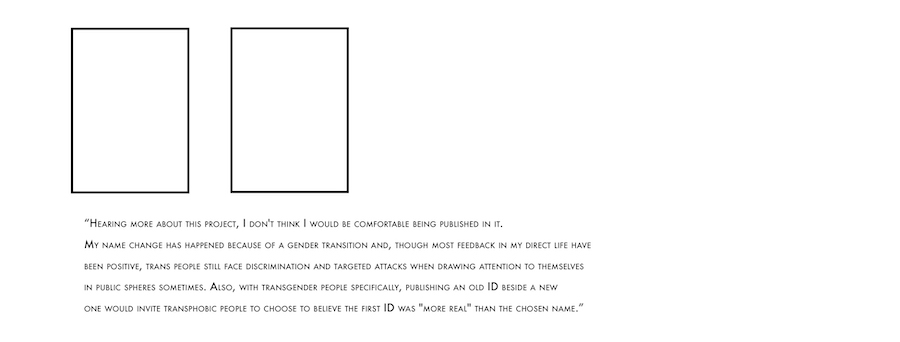 Strangers To Ourselves is a project about travellers within their own identity. It presents a collection of photo id’s of individuals who are performing, stating or questioning their identity through the change of name; sometimes official, sometimes not. Some of the travellers are fleeing their roots while some are coming back to them after a long separation. Some have been always feeling that their name does not belong to their body. These are travelling home. Some are redefining themselves as more complex or more simple. Some are making subtle political statements. What is common for all the strangers is a state of destabilization, fluidity. They all took a conscious decision to commit a journey to the unknown destination.